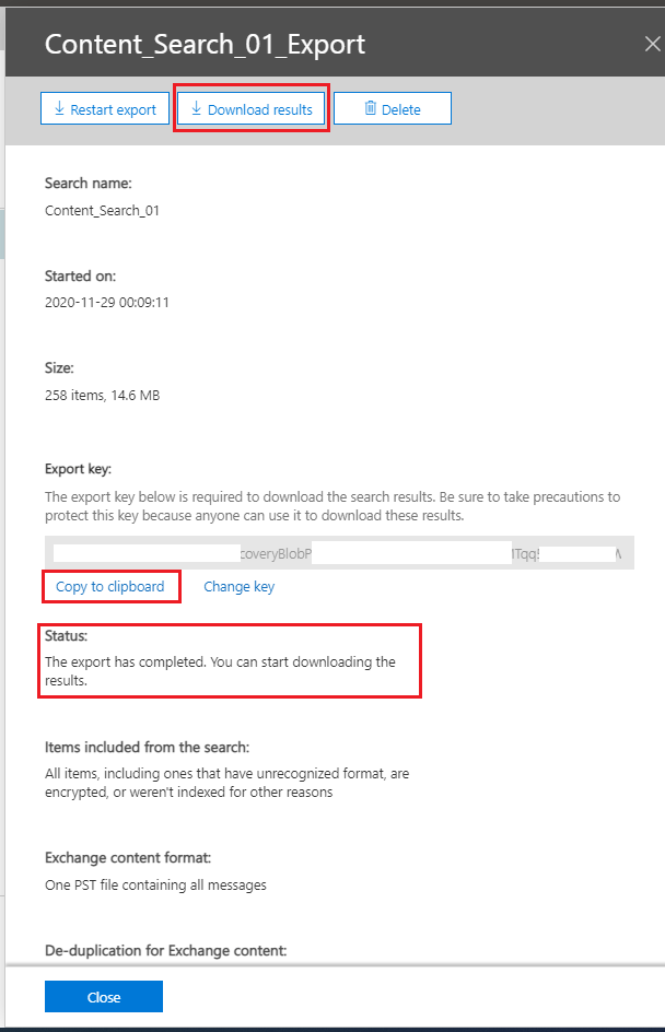 Clique on “Copy to clipboard” to copy the “Export secret” and click on “Download the result”. On the next page, enter the Export secret and specify the location where to save the pst file.