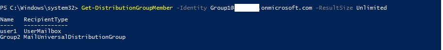 Get-DistributionGroupMember -Identity Group1@jmatech.onmicrosoft.com -ResultSize Unlimited