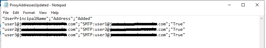 $ProxyAddresseUpdated = "C:\Temp\ProxyAddressesUpdated.csv" #Log file